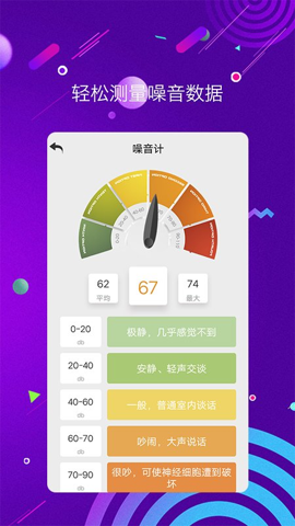 1、支持噪音计算功能,可以帮助用户计算周围的噪音。用户还可以将手机测量器的水平线与物体的一段保持平行,以便进行测量。