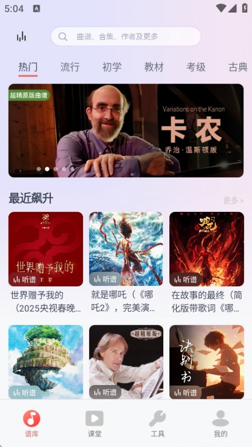 钢琴谱大全APP下载安装(PianoSpectrum)是一款能够方便小伙伴们在日常自由时间内轻松愉快的倾听各种钢琴曲目作品并练习任意钢琴曲的手机钢琴音乐学习平台软件。在这款软件中,除了各种世界知名的钢琴曲目作品之外小伙伴们也是可以发现许多流行音乐作品的钢琴曲谱资源来进行学习练习使用的,并且许多热门电影电视剧动画等作品中的音乐BGM内容也都是有着全新上架发布的钢琴曲谱项目可以让小伙伴们快速发现的,因此小伙伴们在练习传统知名的钢琴曲作品曲谱内容之余也是可以练习学习许多二次元、影视、游戏等领域内音乐作品的钢琴声音的,所以喜欢钢琴音乐并不打算拘泥于传统钢琴声音内容的小伙伴们都是不可错过的。感兴趣的小伙伴们快来下载看看吧!