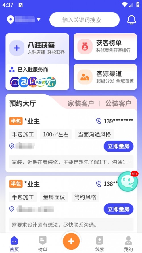 装企客源引擎APP下载手机版,这款软件是可以让小伙伴们的装修工作体验变得更为轻简化且在拓客展业方面获得更多助力帮助的。