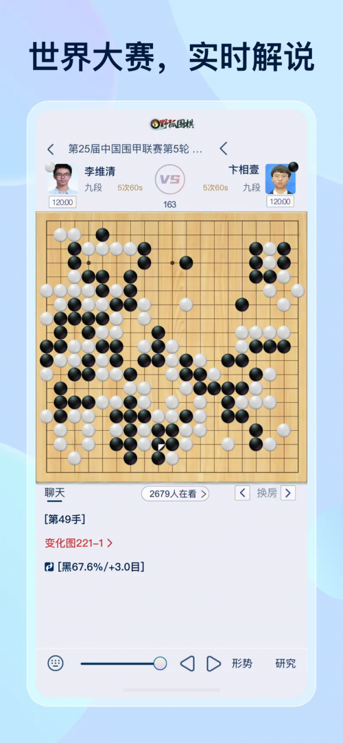 专业赛事:野狐围棋与中国围棋协会合作,定期举办线上围棋赛事,许多职业棋手也会在平台上对局,提供了与职业高手切磋的机会。