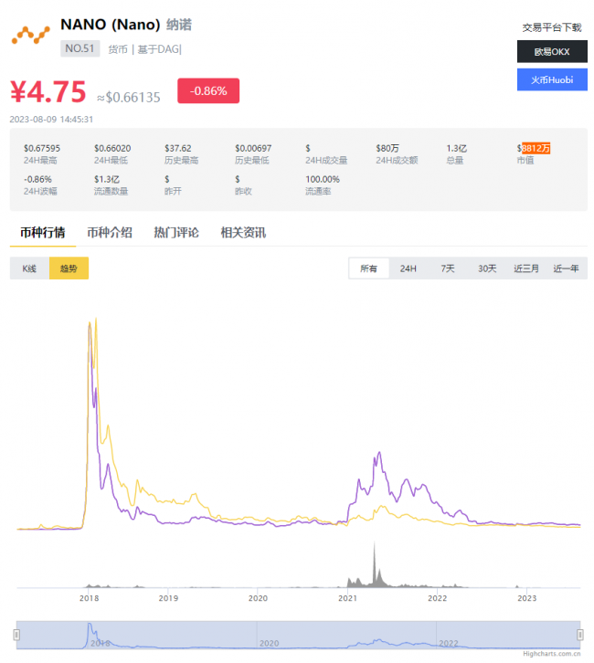 根据“币界网”平台当前最新消息,截止2023年08月09号 14:45,NANO币的市场行情价格数据详细内容为